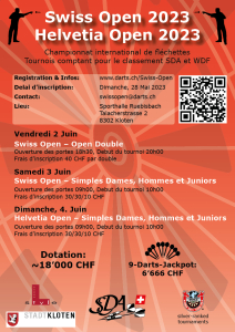 Le Swiss Open et l'Helvetia Open font leur retour dans la région de Zurich. Les deux tournois seront à nouveau des tournois WDF de catégorie argent et se dérouleront du 2 au 4 juin dans la salle de sport Ruebisbach à Kloten.